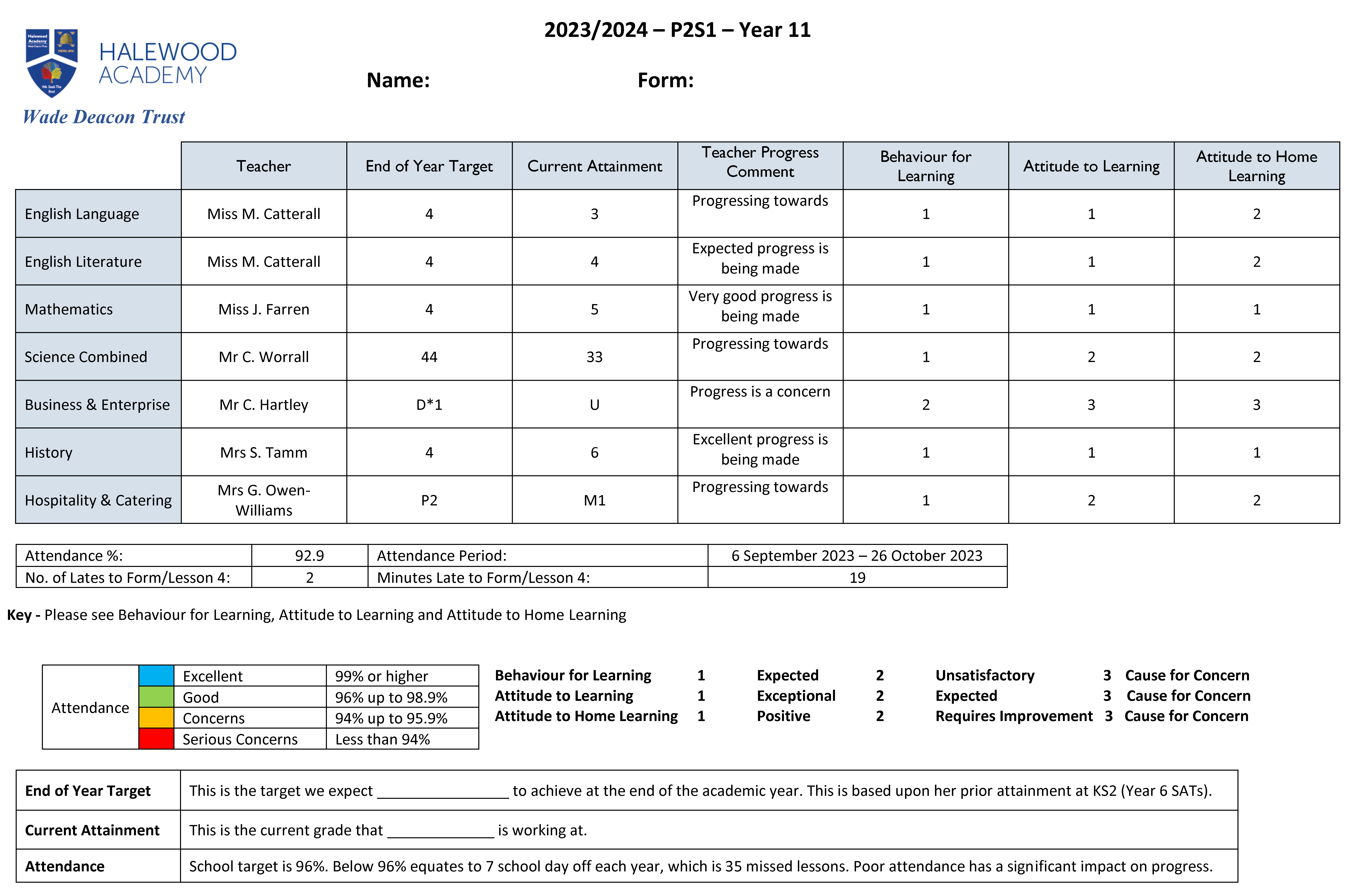Examples of Year 9, 10 and 11 P2S1 Grade Card and Report below: