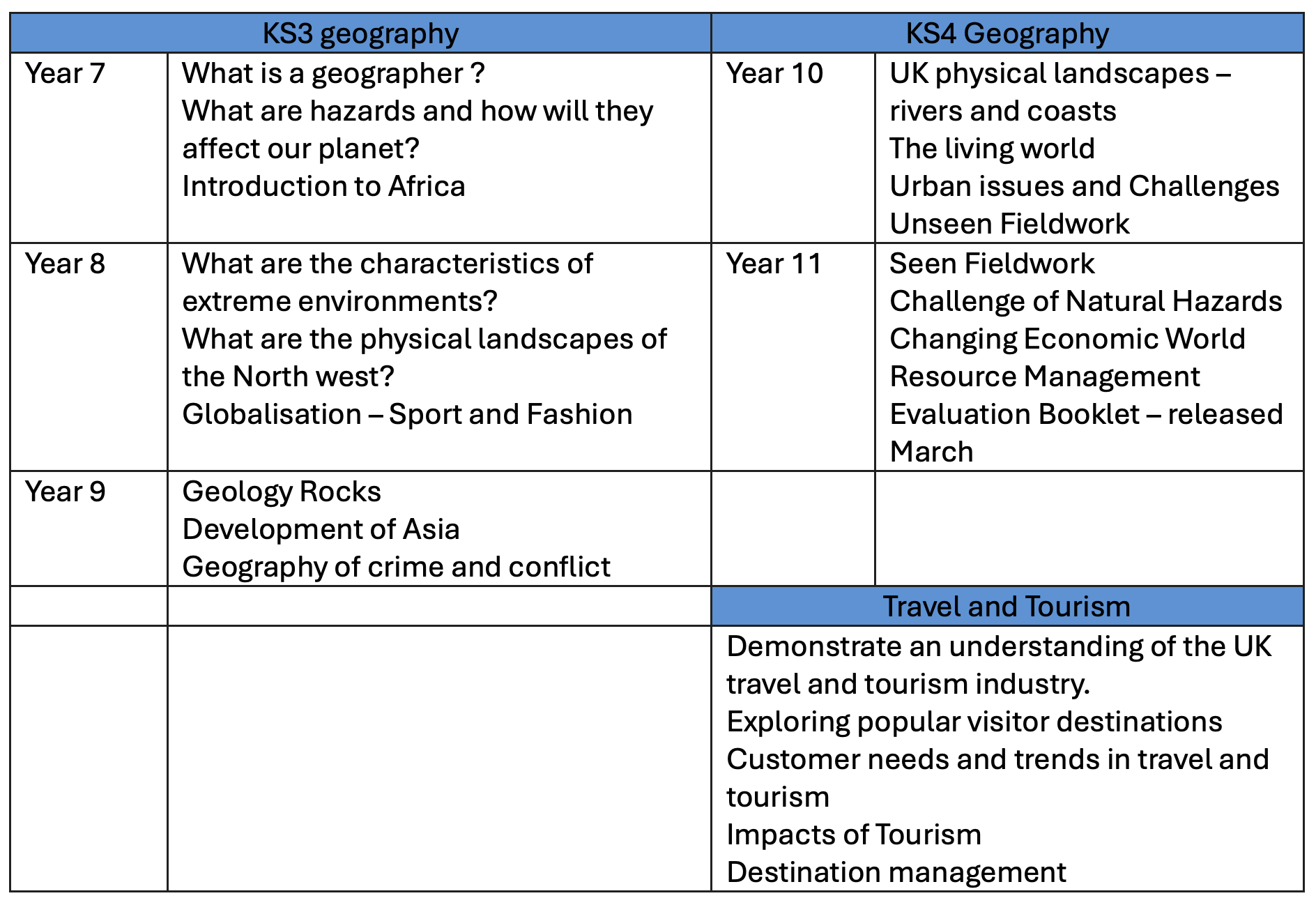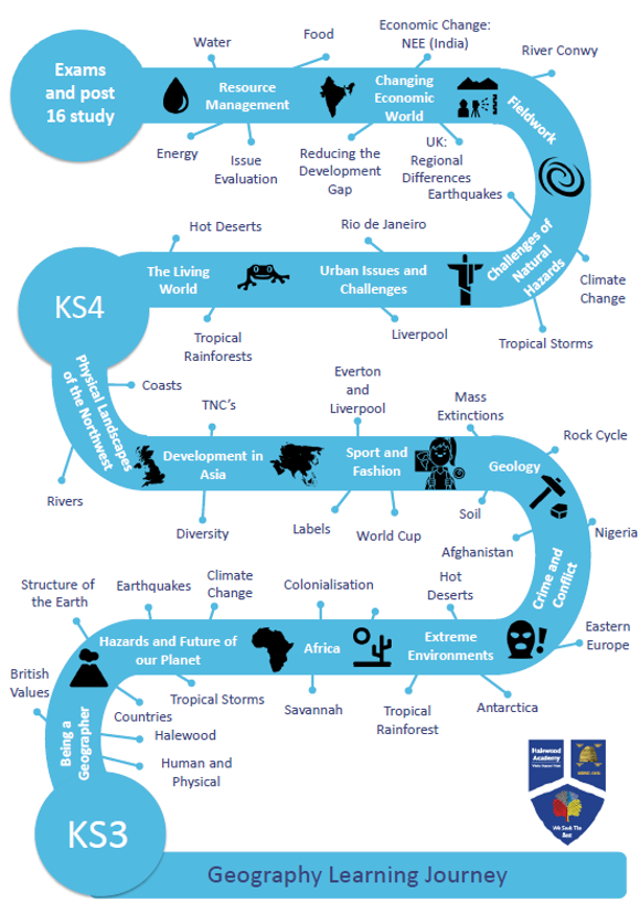 Students who study Geography at Halewood Academy will have the opportunity to develop key skills. Our curriculum is purposefully designed to be rich in opportunities for students to develop our RACER core values. Each year builds on previous learning through a spiralled curriculum with key concepts revisited, with varying level of detail and a wide-ranging use of exemplar case studies so that content is never repeated. We use up to date case studies to inspire and promote interest from pupils. Pupils develop an understanding of their place in society and the wider world, developing knowledge of international agreements and unions such as the EU and Commonwealth.