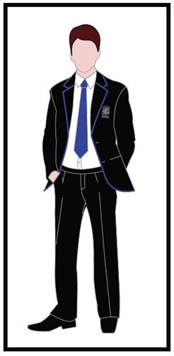 Black blazer with blue trim and Academy badge