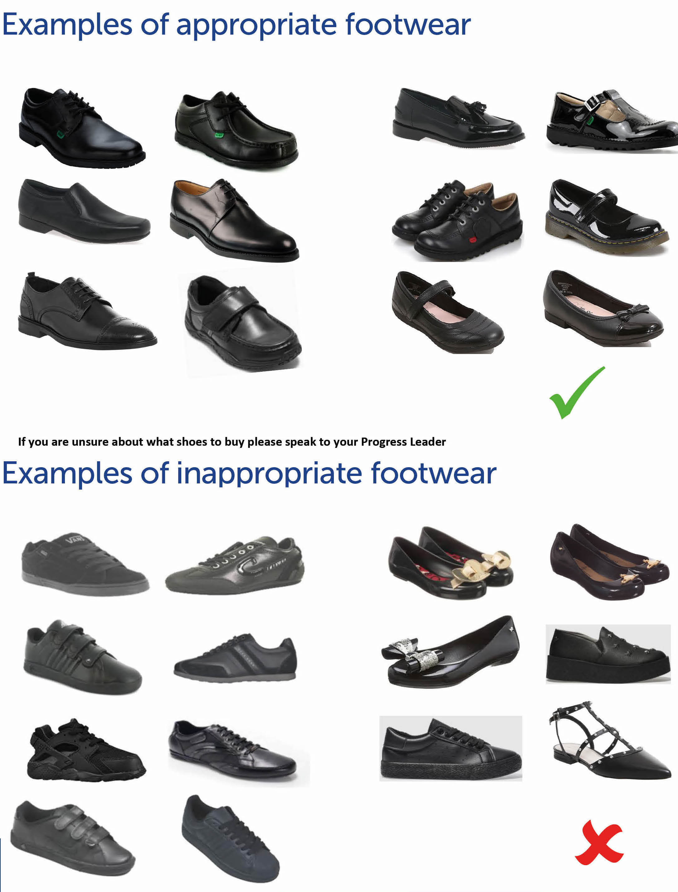 Sensible plain black shoes - See pictures below for examples of good and bad.