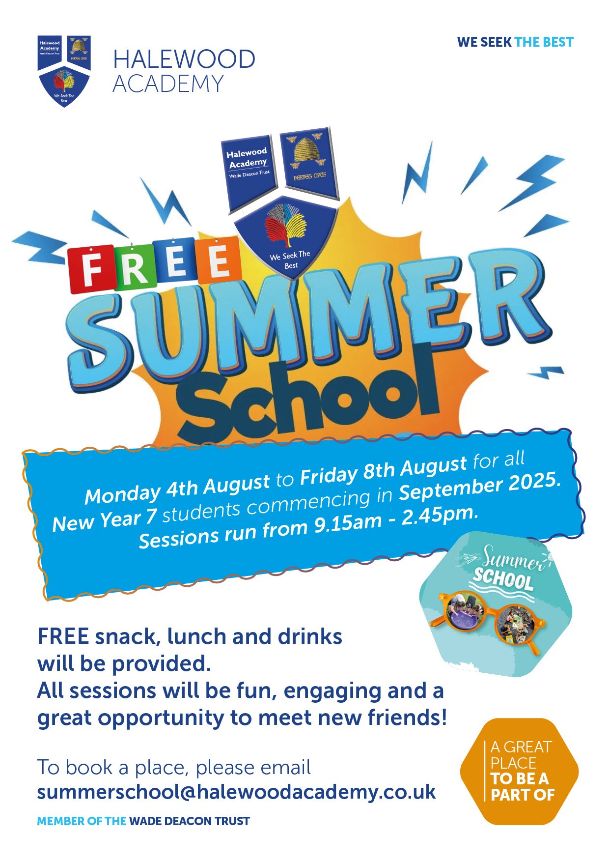 Halewood Academy are please to announce we are running our annual Summer School 2025 transition on Monday 4th August to Friday 8th August 2025 for all new Year 7 Students Commencing in September.